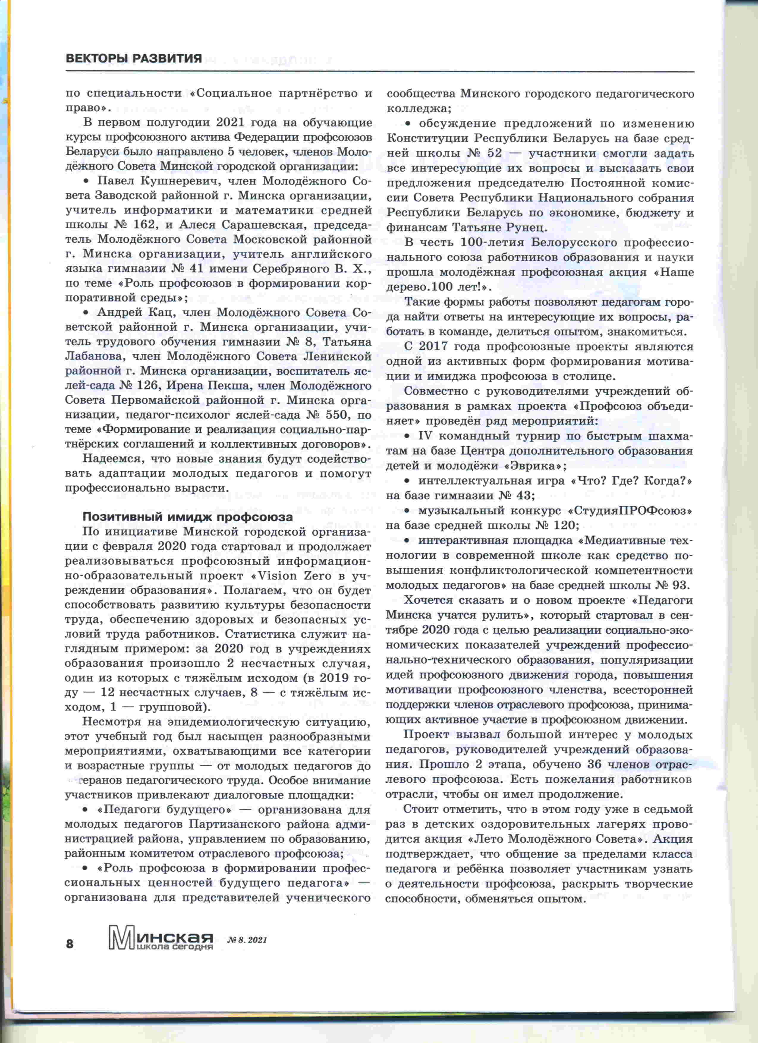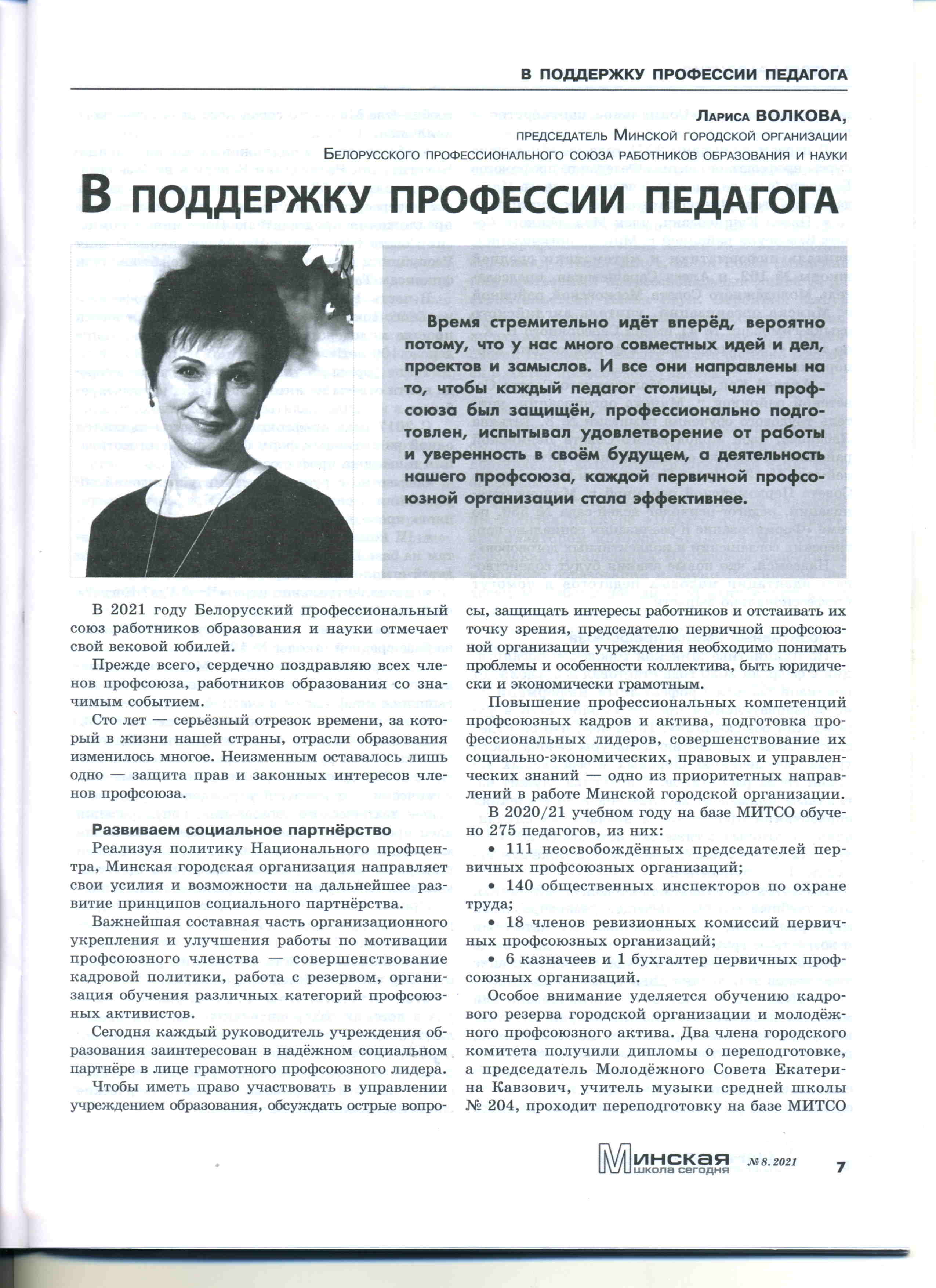 Председатель Минской городской организации Белорусского профессионального союза работников образования и науки дала интервью редакции журнала "Минская школа".