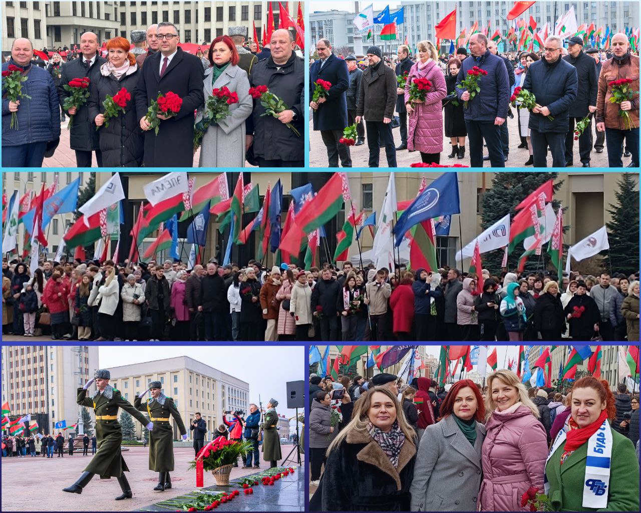 В митинге приняли участие представители ФПБ, МГО Профсоюза, органов государственной власти, партий и общественных организаций, дипломатического и депутатского корпусов, руководство районов Минска и руководители организаций, представители трудовых коллективов.