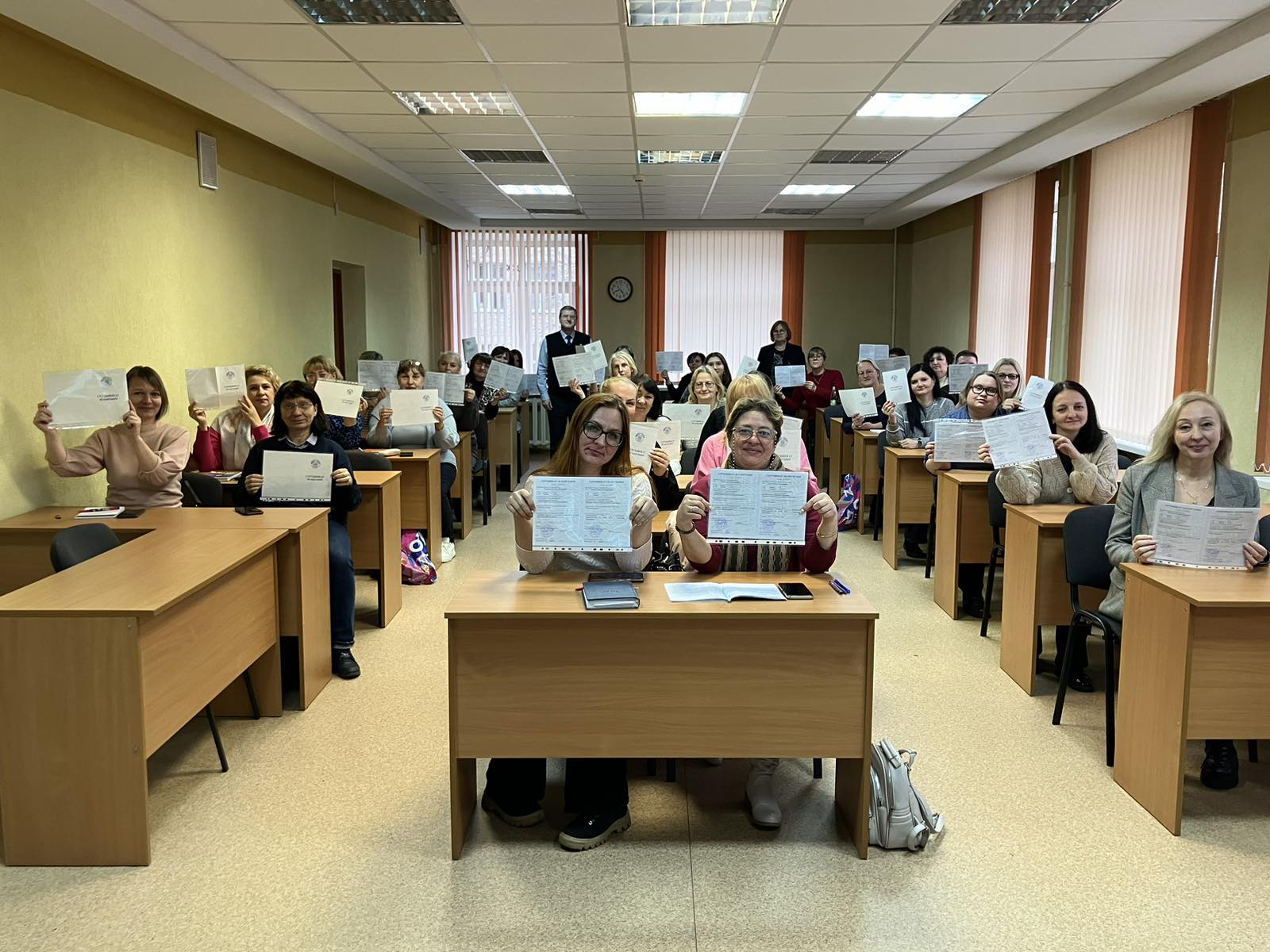 32 общественных инспекторов по ОТ ППО учреждений образования прошли обучающие курсы по теме «Общественный контроль за соблюдением законодательства по охране труда в учреждении образования» и получили сертификаты об обучении в рамках совместного образовательного проекта "Школа общественного инспектора по охране труда" МГО Профсоюза и Минского городского института развития образования